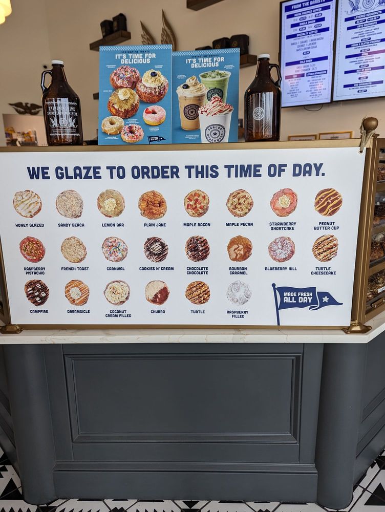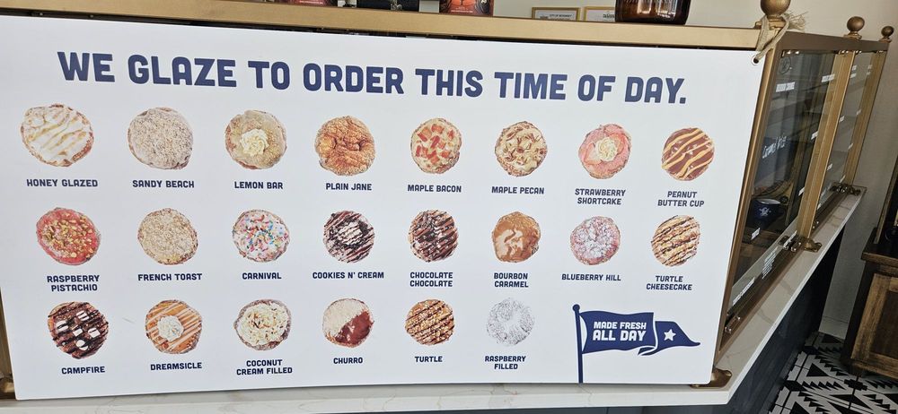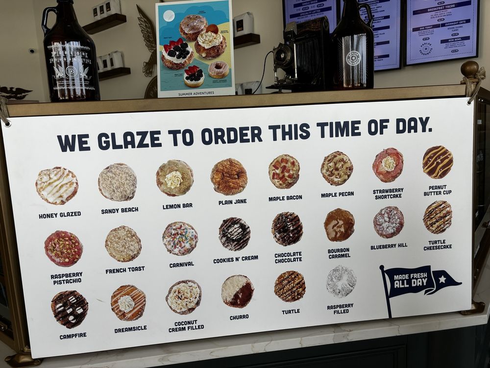 Our Maple Pecan doughnut combines the crunch of pecans with the sweetness of maple, all atop our signature layered doughnut. A rich maple glaze and a final drizzle of syrup enhance the nutty, sweet flavors, making every bite a decadent experience.